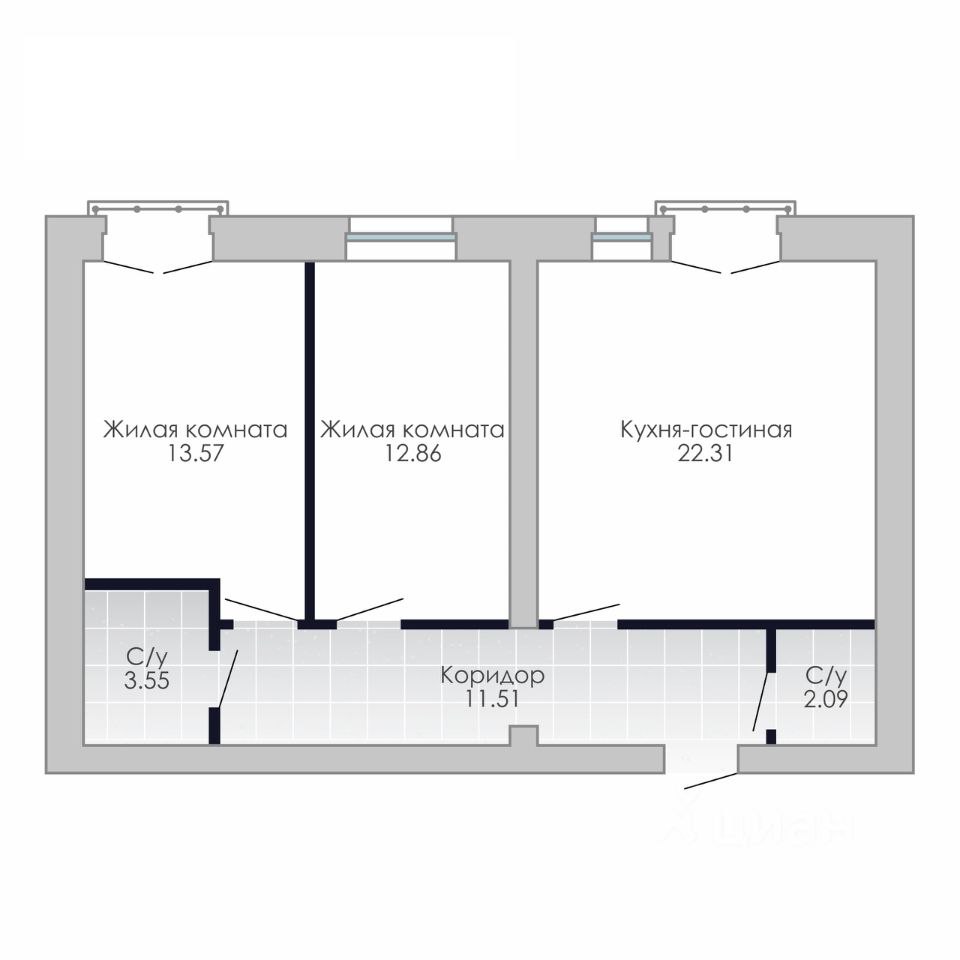 Двухкомнатная квартира 65,88 м² с панорамными окнами. Полная автономия и закрытая территория с видеонаблюдением.